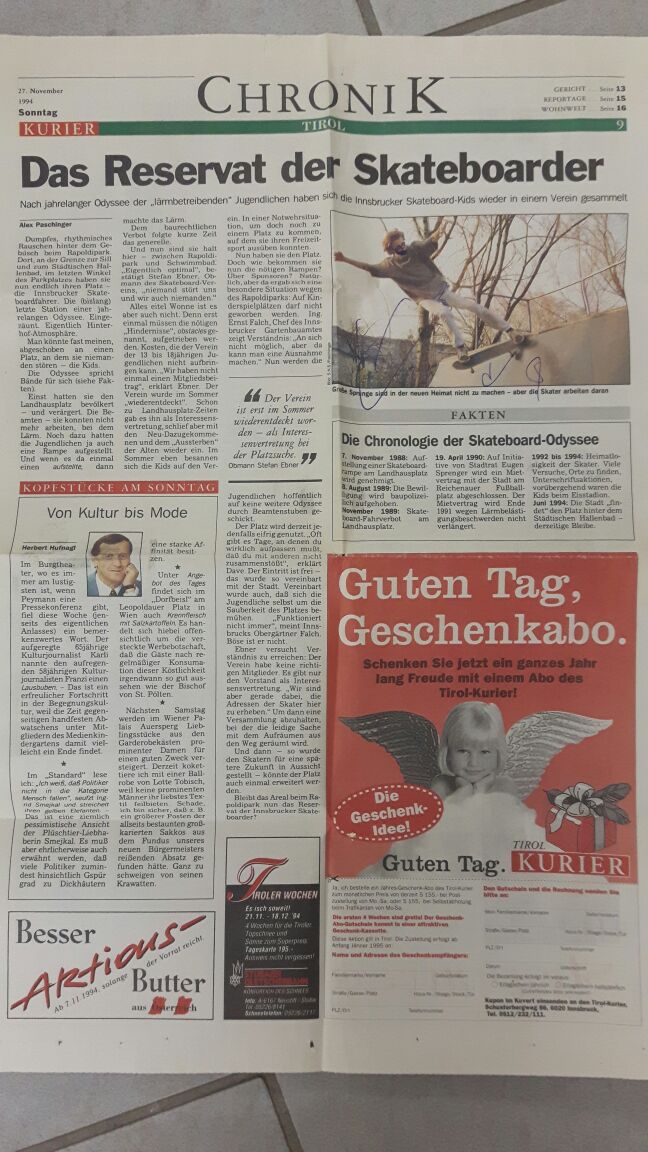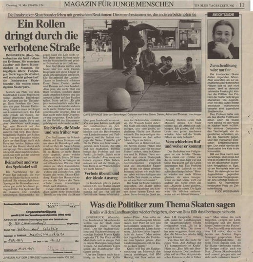 1994 gab es durch das Verbot am Landhausplatz Anfang der Neunziger schon ein paar Jahre keinen zentralen Spot. Skateboarding spielte sich auf der Straße, auf Firmengeländen und in Industriegebieten ab. Was die Jugendlichen von damals im Beitrag der Tiroler Tageszeitung noch beklagten, wünschen sich heute viele in verklärter Romantik zurück – die gute alte Zeit, als Skaten noch „rough“ war, als man sein halbes Leben auf der Straße verbrachte, im Clinch mit Passanten und Anwohnern, auf der Flucht vor der Polizei und beim Biertrinken mit Obdachlosen und als man mit Skateboarden noch rebellieren konnte.