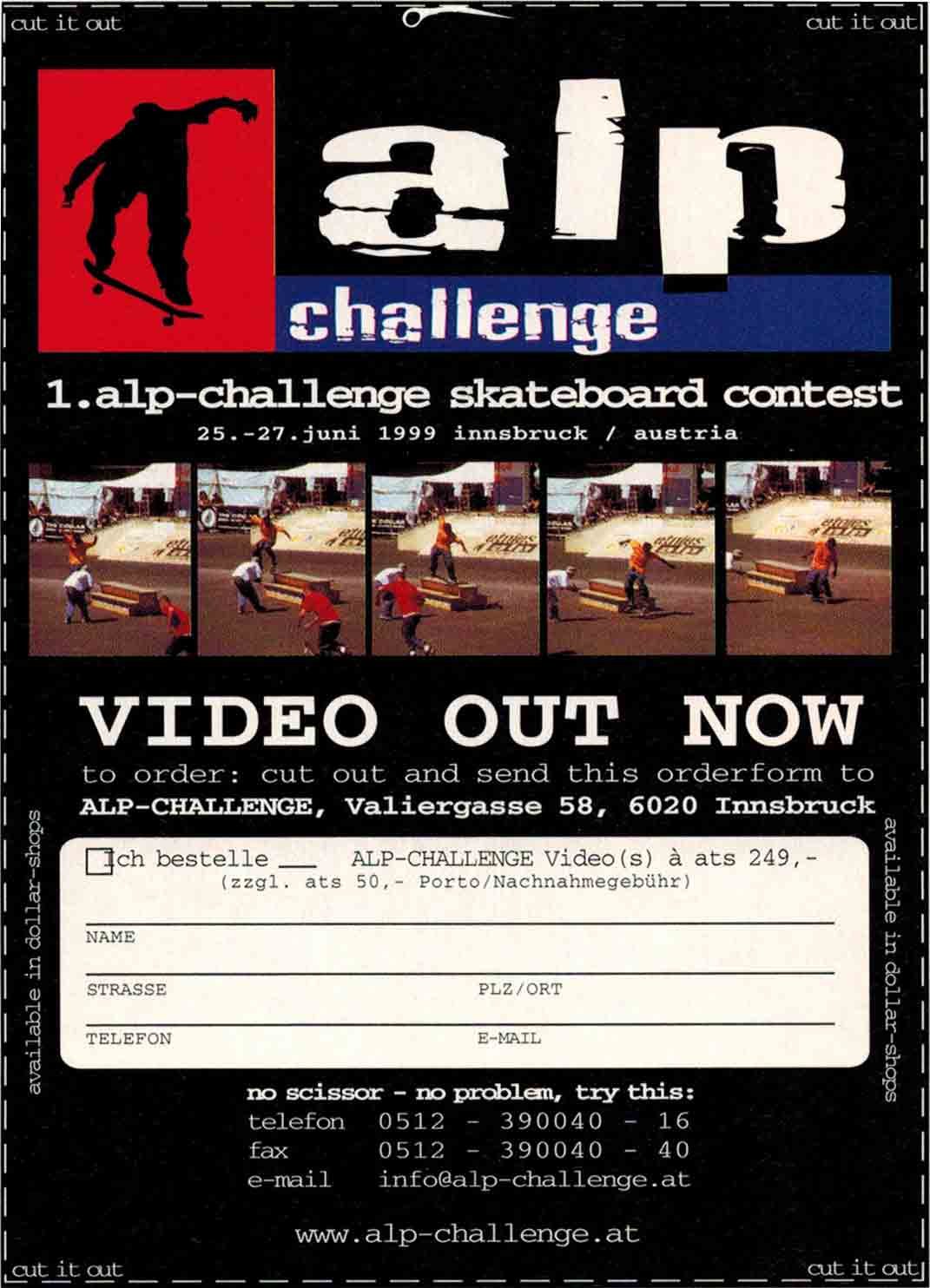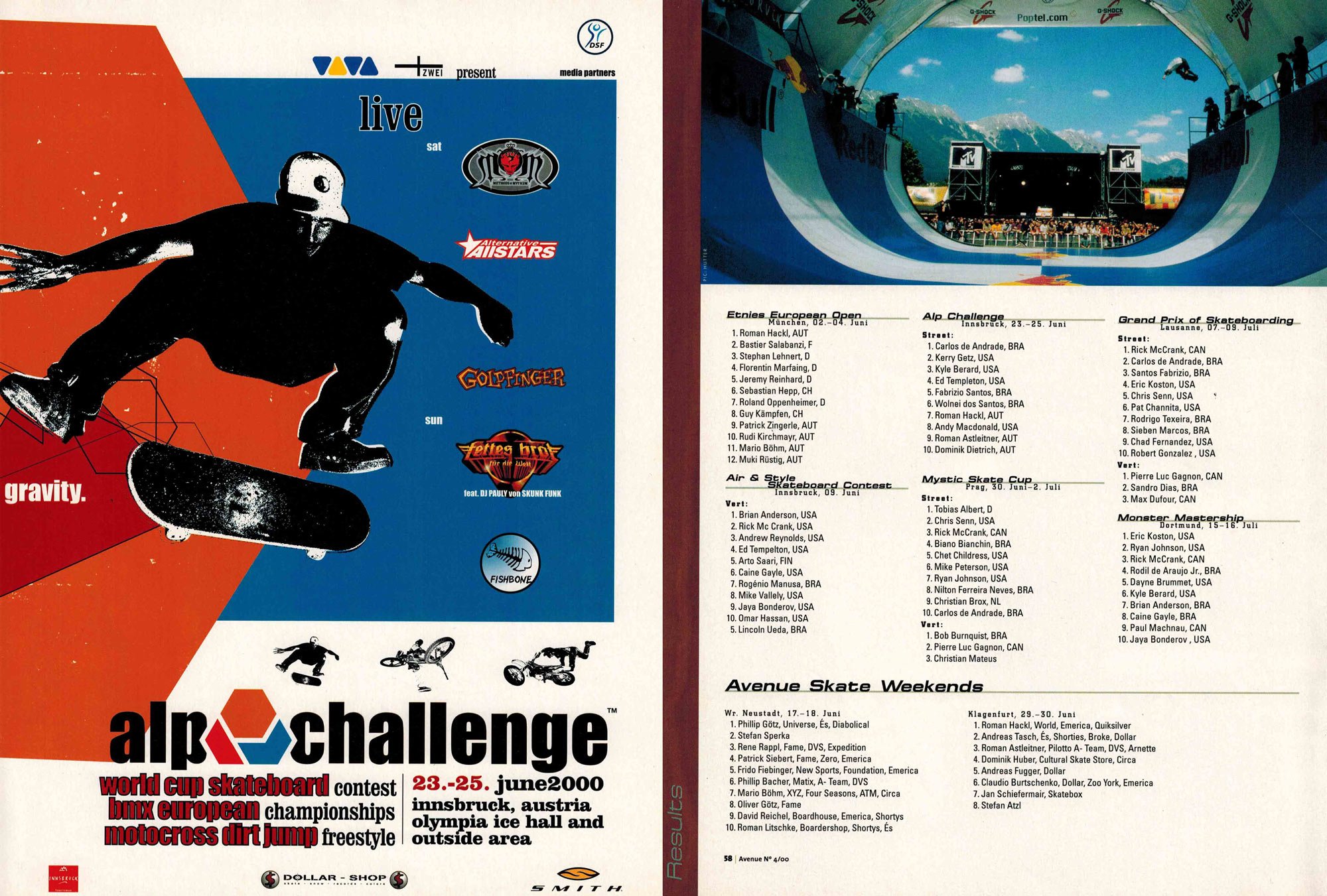 Wir sind wirklich stolz darauf, dass wir seit 2012 große, internationale Contests in Innsbruck auf die Beine stellen. Aber was sich im Sommer 2000 in Innsbruck abgespielt hat, daran konnten wir beim besten Willen noch nicht annähernd heran kommen. Die Jahrtausendwende war eine goldene Zeit für den Skateboardmarkt und damals erwirtschafteten nationale Vertriebe noch schöne Gewinne. So schöne Gewinne, dass ein Vertrieb mit Sitz in Innsbruck 1999 auf die Idee kam, einen mit internationalen Pros besetzten Contest hier zu veranstalten. 2000 ging man noch einen Schritt weiter, mietete die Innsbrucker Olympia Eishalle und hatte neben Street auch Halfpipe und Motocross im Programm.Die Tage um den Contest herum herrschte tatsächlich eine unglaubliche Atmosphäre in Innsbruck. Fahrer, die man nur aus Videos kannte, skateten plötzlich die Ledges beim Landesgericht oder Idole wir Rick McCrank pushten plötzlich auf der Straße an einem vorbei. So schön und motivierend der Event für die Skateszene war, so bitter war das Ende: Die Veranstalter hatten sich mit den Kosten maßlos übernommen, die zweite "Alp Challenge" blieb auch die letzte. Und gleichzeitig auch der letzte internationale Skate Event in Innsbruck für die nächsten 12 Jahre.