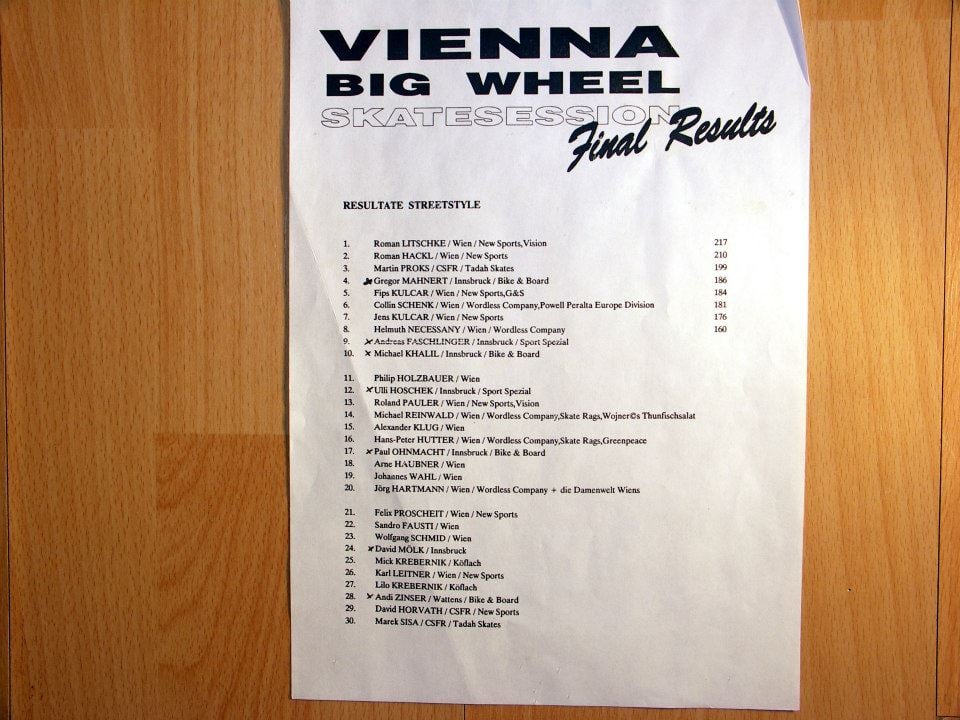 Bevor das Innsbrucker Rathaus zum Glaspalast mit Shops und Gastronomie umgebaut wurde, gab es dort einen großen Innenhof mit Parkplatz. Neben Autos standen des abends dort auch oft Gruppen von Jugendlichen herum, die ihren Genussmittelkonsum nicht auf Cafes und Bars beschränken wollten. Außerdem bot der Einfahrtsschranken dort auch die Messlatte für massiven Ollie-Pop (dokumentiert hat ihn nur Moritz Anzelini jemals bezwungen). Und es gab zumindest einmal auch einen Contest dort. Leider haben wir kein Bild und schon gar kein Videomaterial, aber die Ergebnisliste dokumentiert zumindest die Größen der lokalen Szene zu dieser Zeit.