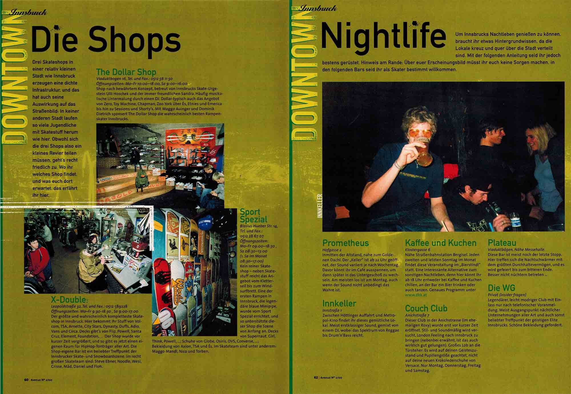 "Avenue" der Stadt Innsbruck einen "City-Check" (Eine Serie von Städte Portraits einiger Landeshauptstädte). Ausschnittweise werden Locals und Spots beleuchtet, die damaligen Shops der Stadt