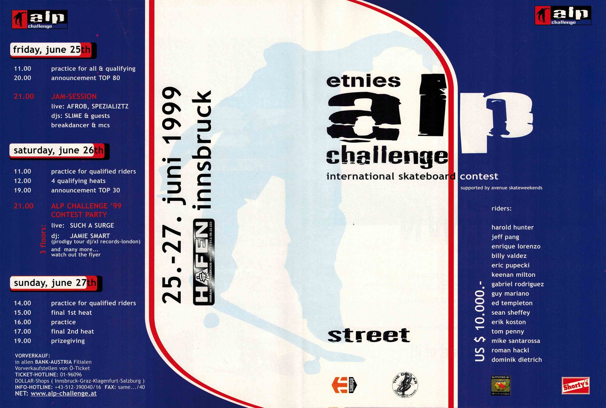 1999 beschloss man, eine eigene Event-GmbH zu gründen und einen internationalen Contest in Innsbruck zu veranstalten. Tatsächlich war die erste Alp Challenge der bis zu diesem Zeitpunkt größte Street Contest in Österreich. Neben namhaften europäischen Fahrern waren die Soletech Teamfahrer Mike Santarossa und Marc Johnson eingeflogen worden. Außerdem noch die LA-Legends Guy Mariano, Eric Pupecki, Fabian Alomar, Joey Suriel und Kareem Campbell sowie Harold Hunter und Jeff Pang aus NYC, dessen Rap-Einlagen beim Konzert am Abend wohl niemand der Anwesenden bis heute vergessen hat. Insgesamt waren viele der US-Stars mehr zum Party-machen in Innsbruck als zum Skaten - aber mit ihnen abzufeiern war für die Locals mindestens genauso aufregend...
