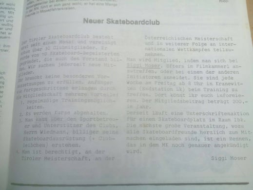 Das Fundstück, von dem die Recherche des Subkultur-Archiv Innsbruck nach den Wurzeln der Innsbrucker Skate-Szene ausging. Lange Zeit konnte nichts Näheres zum offensichtlich allerersten Skateboardverein in Innsbruck, dem “Tiroler Skateboardclub” herausgefunden werden – außer, dass er im Umfeld des Innsbrucker Jugendzentrums MK gegründet worden sein muss und dass dieses Schriftstück mit 1979 datiert ist. In einem Beitrag aus der Mai-Ausgabe des 20er wird die Entstehungsgeschichte näher beleuchtet.