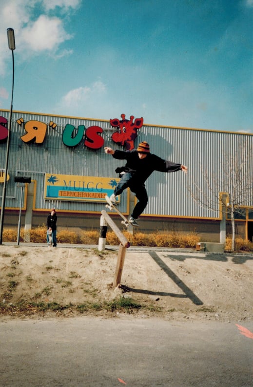 Anfang der Neunziger waren die Rollen winzig, die Boards schmal, die Hosen weit und die Innsbrucker Skateszene zahlenmäßig sehr überschaubar. Wochentags war das Skaten ein Spießrutenlauf von Spot zu Spot (von denen es tatsächlich auch nur sehr wenige gab) in der Hoffnung, irgendwo länger als 15 Minuten skaten zu können. Mehr oder weniger in Ruhe skaten konnte man an den Wochenenden auf den Parkplätzen der Supermärkte, wo man sich teilweise Obstacles zusammenzimmerte und irgendwo versteckte, um sie am Wochenende hervorzuholen. Wie zum Beispiel hier am Parkplatz des damaligen Merkur Marktes in Neu-Rum, wo sogar einmal ein Contest stattfand - mit einem Startgeld von je 1 Überraschungsei, der Sieger konnte sich dann den Bauch vollschlagen.